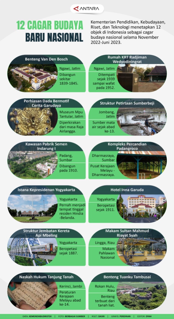 MINANGKABAUNEWS.com, JAKARTA — Kementerian Pendidikan, Kebudayaan, Riset, dan Teknologi menetapkan 12 objek di Indonesia sebagai cagar budaya nasional selama November 2022-Juni 2023. (antaranews.com)