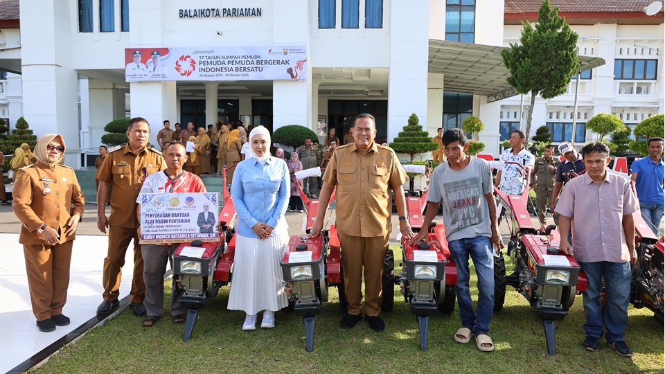 MINANGKABAUNEWS.COM,Pariaman—Sebanyak 18 kelompok tani di Kota Pariaman menerima bantuan alat dan mesin pertanian (Alsintan ) dari Kementerian Pertanian melalui aspirasi Anggota Komisi IV DPR RI Daerah Pilihan Sumatera Barat 2, Cindy Monica Salsabila Setiawan di Aula Balaikota Pariaman, Senin (27/10).