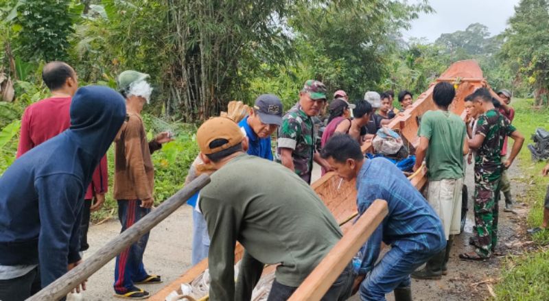 MINANGKABAUNEWS.COM, MENTAWAI – Babinsa Koramil 03 Sipora Serka Robin dan Serda Subroto langsung bergerak membantu masyarakat yang mengangkat potongan sampan dari hutan keluar pantai.