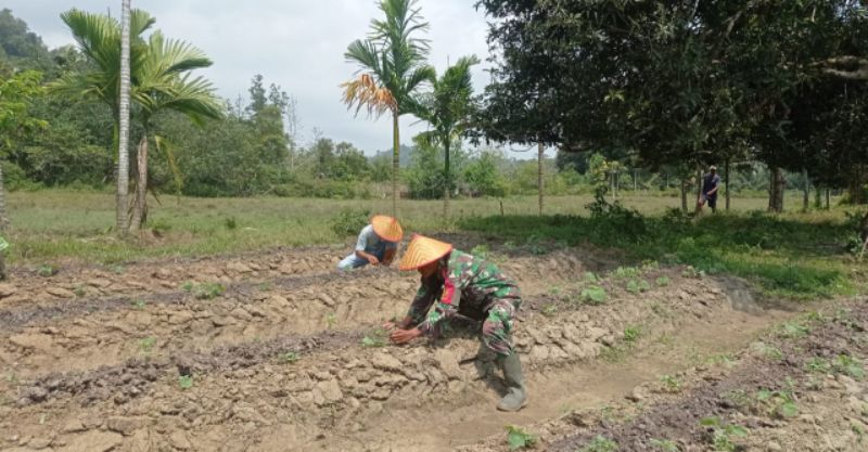 Babinsa bersama Bapak Johan Samaloisa di Dusun Maurau Desa Bulasat Kecamatan Pagai Selatan melakukan penanaman tanaman serta perawatan lahan dari gulma.