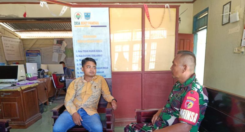 Dalam kesempatan itu, Babinramil berbincang dengan Kepala Desa Bukit Pamewa untuk membahas tentang kegiatan masyarakat saat ini dilakukan.