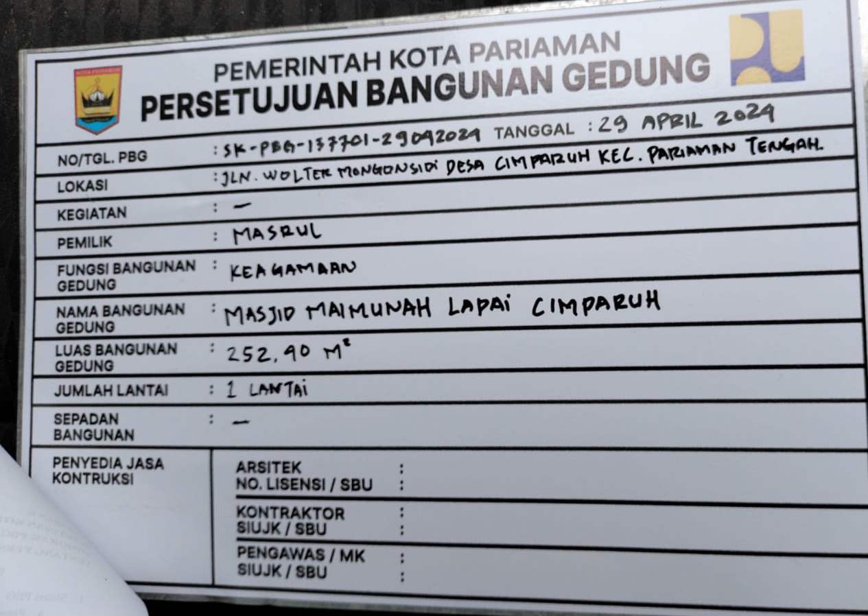 Setelah memberi kesempatan untuk melengkapi bukti, Pemko Pariaman akhirnya menerbitkan IMB/PBG bernomor 137701 tanggal 29 April 2024. IMB terbit atas nama Masrul. Masrul sendiri adalah Ketua Pembangunan sekaligus penerima waqas dari tanah tempat pembangunan masjid itu.