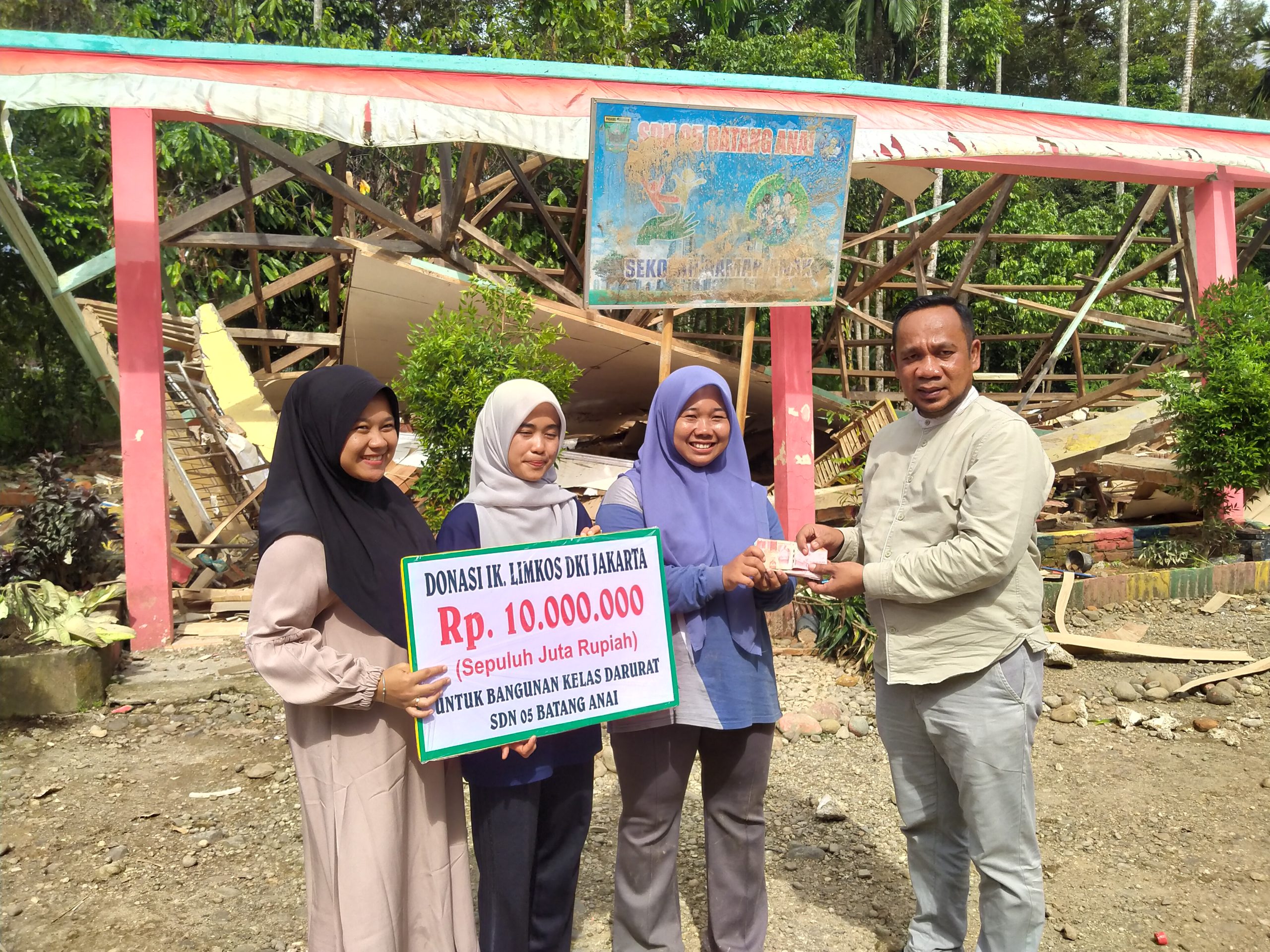 “Bantuan ini dari IKA-LIMKOS Jabodetabek. Semoga bisa meringankan beban pelaksana pendidikan di sekolah ini, dalam membangun lokal darurat,” ujar Aprinaldi, mantan Ketua Umum KONI Padang Pariaman ini.
