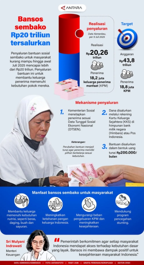 MINANGKABAUNEWS.com, INFOGRAFIS — Penyaluran bantuan sosial sembako untuk masyarakat kurang mampu hingga awal Juli 2025 mencapai lebih dari Rp20 triliun. Penyaluran bantuan ini untuk membantu keluarga penerima memenuhi kebutuhan pokok mereka. (ANTARA)