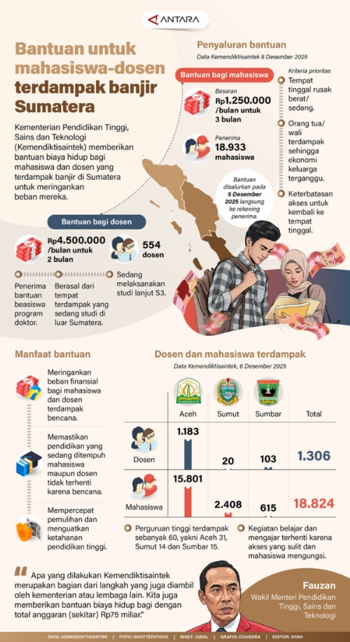 MINANGKABAUNEWS.com, INFOGRAFIS — Kementerian Pendidikan Tinggi, Sains dan Teknologi (Kemendiktisaintek) memberikan bantuan biaya hidup bagi mahasiswa dan dosen yang terdampak banjir di Sumatera untuk meringankan beban mereka. (ANTARA)
