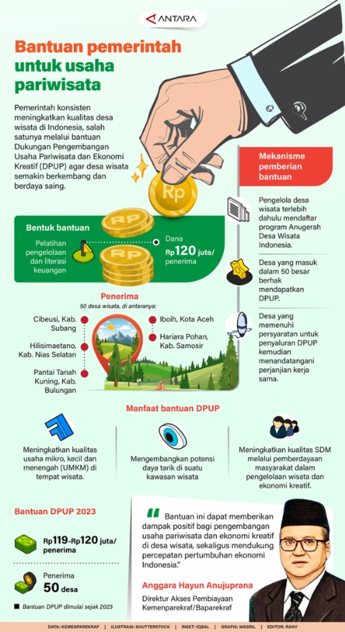 MINANGKABAUNEWS.com, INFOGRAFIS — Pemerintah konsisten meningkatkan kualitas desa wisata di Indonesia, salah satunya melalui bantuan Dukungan Pengembangan Usaha Pariwisata dan Ekonomi Kreatif (DPUP) agar desa wisata semakin berkembang dan berdaya saing. (ANTARA)