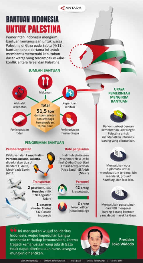 MINANGKABAUNEWS.com, INFOGRAFIS — Pemerintah Indonesia mengirim bantuan kemanusiaan untuk warga Palestina di Gaza pada Sabtu (4/11), bantuan tahap pertama ini untuk membantu memenuhi kebutuhan dasar warga yang terdampak eskalasi konflik antara Israel dan Palestina. (antaranews.com)
