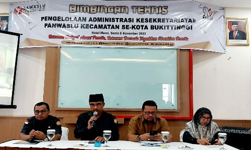 MINANGKABAUNEWS.com, BUKITTINGGI – Badan Pengawas Pemilihan Umum (Bawaslu) Kota Bukittinggi menggelar kegiatan Bimbingan Teknis (Bimtek) Pengelolaan Administrasi Kesekretariatan Panwaslu Kecamatan se-Kota Bukittinggi, bertempat di Hotel Mersi, Senin (6/11/2023).