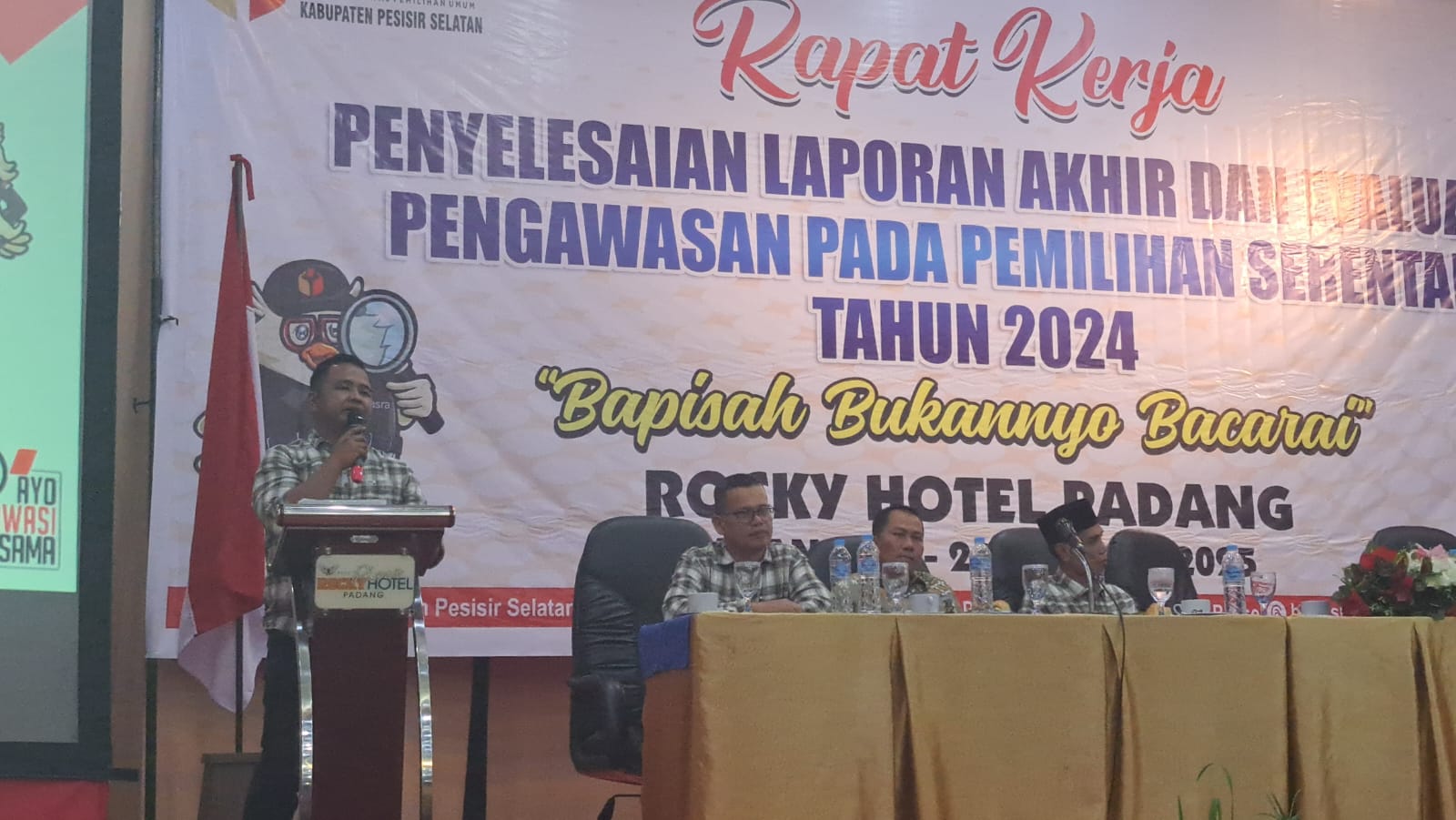 Kepala Sekretariat Bawaslu Kabupaten Pesisir Selatan, Rinaldi Dasar, dalam sambutannya menyampaikan bahwa rapat kerja ini bertujuan untuk memberikan pertanggungjawaban atas evaluasi kinerja dan pengawasan selama pelaksanaan pemilihan serentak.
