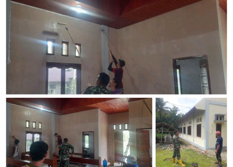 Babinsa dalam hal ini, membantu warga jemaat Katolik dalam proses rehap bangunan pengecatan dinding gedung Gereja Katolik Stasi Goisooinan Kecamatan Sipora Utara Kabupaten Kepulauan Mentawai. Senin, (17/02/2025).