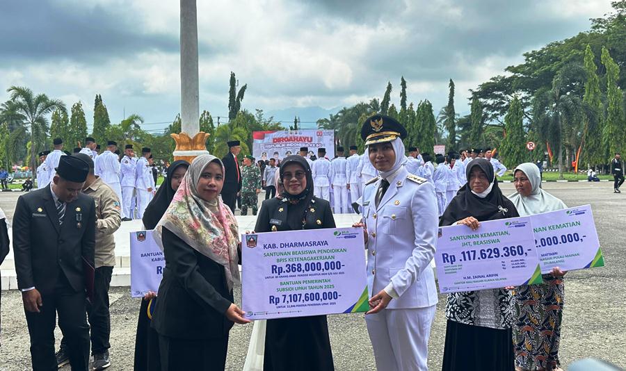Pada momen itu BPJS Ketenagakerjaan menyerahkan secara simbolis kepada Pemkab Dharmasraya, santunan beasiswa yang sudah dibayarkan pada semester I tahun 2025, kepada masyarakat Dharmasraya dengan nilai total santunan Rp368.000.000 dan Bantuan subsidi Upah sebesar Rp7.107.600.000