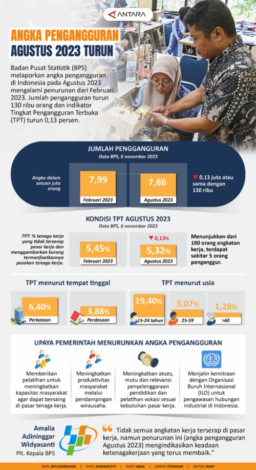 Badan Pusat Statistik (BPS) melaporkan angka pengangguran di Indonesia pada Agustus 2023 mengalami penurunan dari Februari 2023. Jumlah pengangguran turun 130 ribu orang dan indikator Tingkat Pengangguran Terbuka (TPT) turun 0,13 persen.(antaranews.com)