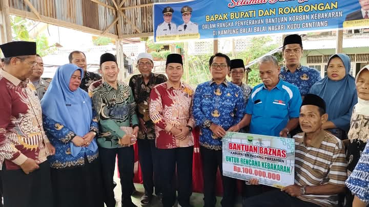 PADANG PARIAMAN, — Bupati Padang Pariaman John Kenedy Azis, Kamis 17 April 2025 menyerahkan bantuan yang bersumber dari Baznas daerah itu kepada korban kebakaran di Kampung Balai-Balai, Nagari Kudu Gantiang, Kecamatan V Koto Timur.