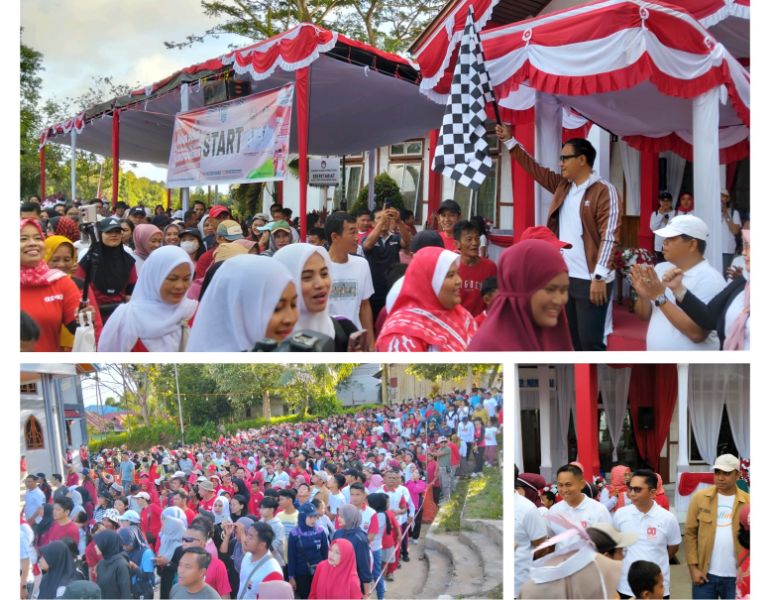 Sebelum kegiatan dimulai, terlebih dahulu seluruh peserta ribuan berkumpul di halaman Kantor Bupati Km 5 sebagai lokasi titik Start gerak jalan sehat dengan titik Finish di kawasan wisata Homestay Mapaddegat. Saptu (16/08/2025)
