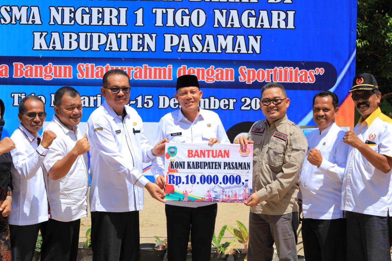 Dalam.kesempatan itu, Bupati Sabar berkenan menyerahkan bantuan uang Rp10 juta dari KONI Pasaman untuk penyelenggaraan turnamen futsal tingkat SMA/SMK/MA se-Sumbar itu. (Verdi)