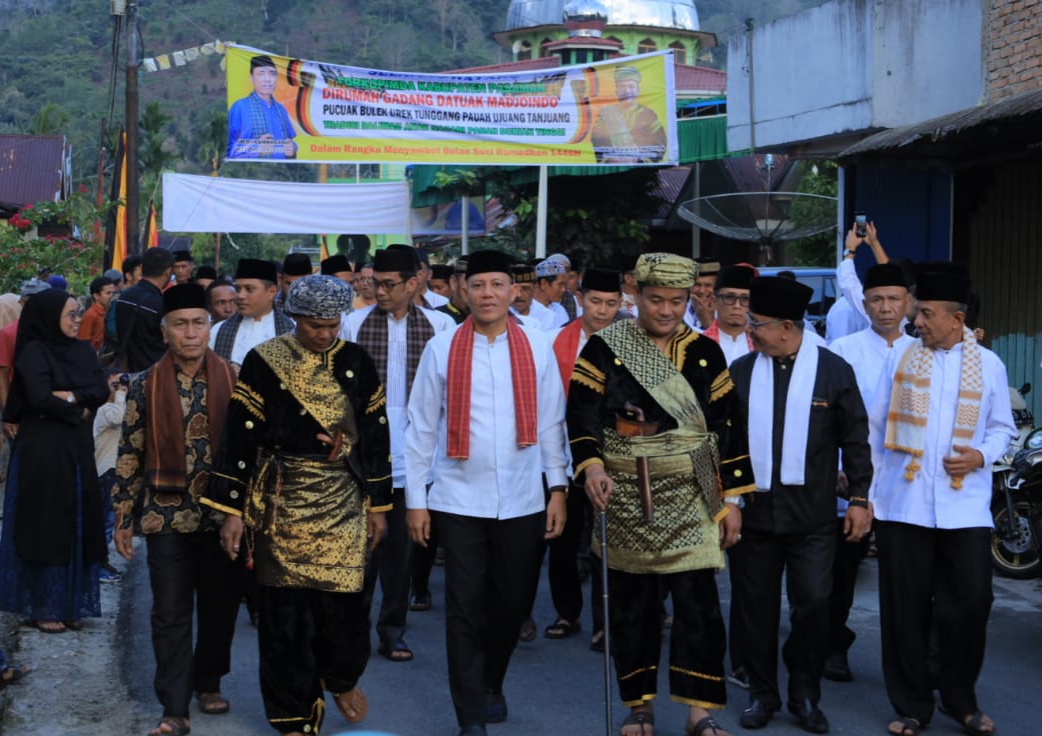 Pasaman, Minangkabaunews.com – Bupati Pasaman, Sabar AS, mengikuti arak-arakan di sepanjang jalan kampung di Kota Lubuk Sikaping, ibukota Kabupaten Pasaman, Jumat (28/2/2025) sore.