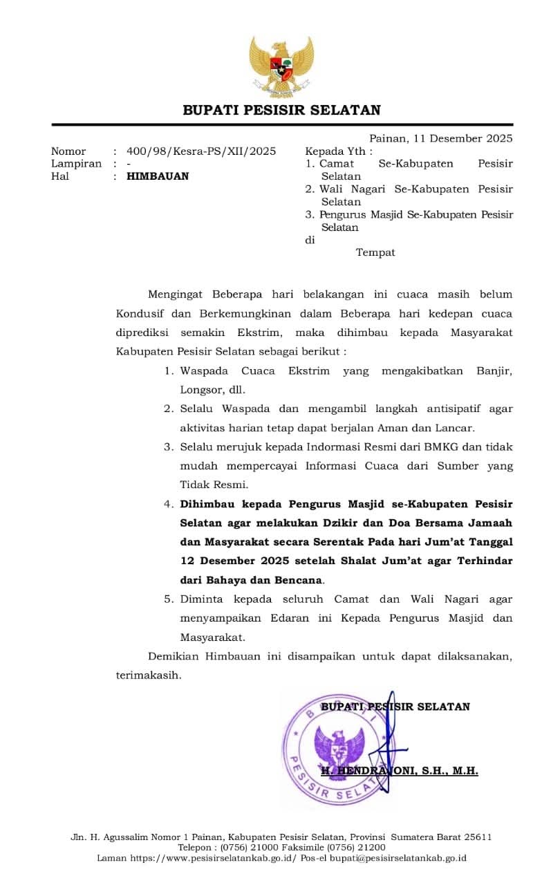 PESISIR SELATAN — Bupati Pesisir Selatan mengeluarkan himbauan resmi kepada seluruh masyarakat menyikapi intensitas cuaca yang masih belum stabil dalam beberapa hari terakhir. Melalui Surat Nomor: 400/98/Kesra-PS/XII/2025 yang terbit pada Kamis, 11 Desember 2025, Bupati menegaskan pentingnya kewaspadaan dan kesiapsiagaan menghadapi potensi cuaca ekstrem yang dapat menimbulkan bencana.