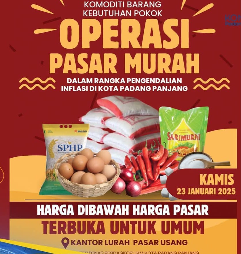 MINANGKABAUNEWS.COM,PADANG PANJANG – Dalam upaya membantu meringankan beban masyarakat menghadapi kebutuhan pokok yang semakin meningkat, Pemerintah Kota (Pemko) melalui Dinas Perdagangan, Koperasi, dan Usaha Kecil dan Menengah (Disperdagkop UKM) akan menggelar Operasi Pasar Murah, Kamis (23/1/2025) besok.