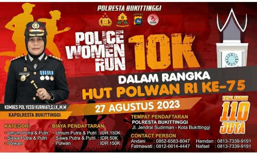 MINANGKABAUNEWS.com – Dalam rangka memperingati Hari Jadi Polisi Wanita Republik Indonesia (Polwan RI) ke-75 tahun 2023, Kepolisian Resor Kota (Polresta) Bukittinggi akan menggelar event olahraga lari 10K dengan tema “Police Women Run 10K.”