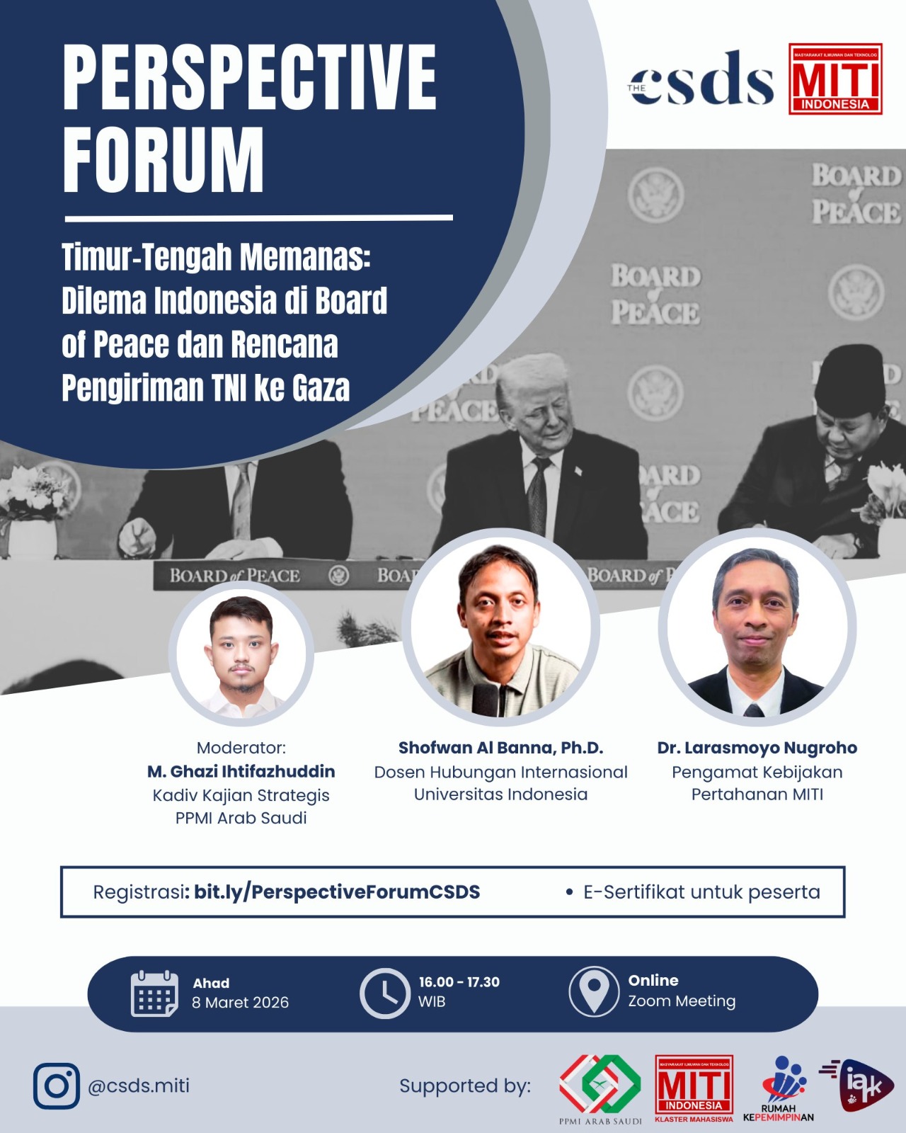 MINANGKABAUNEWS.COM, JAKARTA, – Center for Strategic Development Studies (CSDS) MITI menyelenggarakan diskusi publik bertajuk “Timur-Tengah Memanas: Dilema Indonesia di Board of Peace dan Rencana Pengiriman TNI ke Palestina”. Diskusi ini membedah langkah strategis pemerintah Indonesia di bawah kepemimpinan Presiden Prabowo Subianto yang berencana mengirimkan hingga 8.000 personel TNI ke Gaza sebagai bagian dari International Stabilization Force (ISF) di bawah naungan Board of Peace (BOP) bentukan Donald Trump.