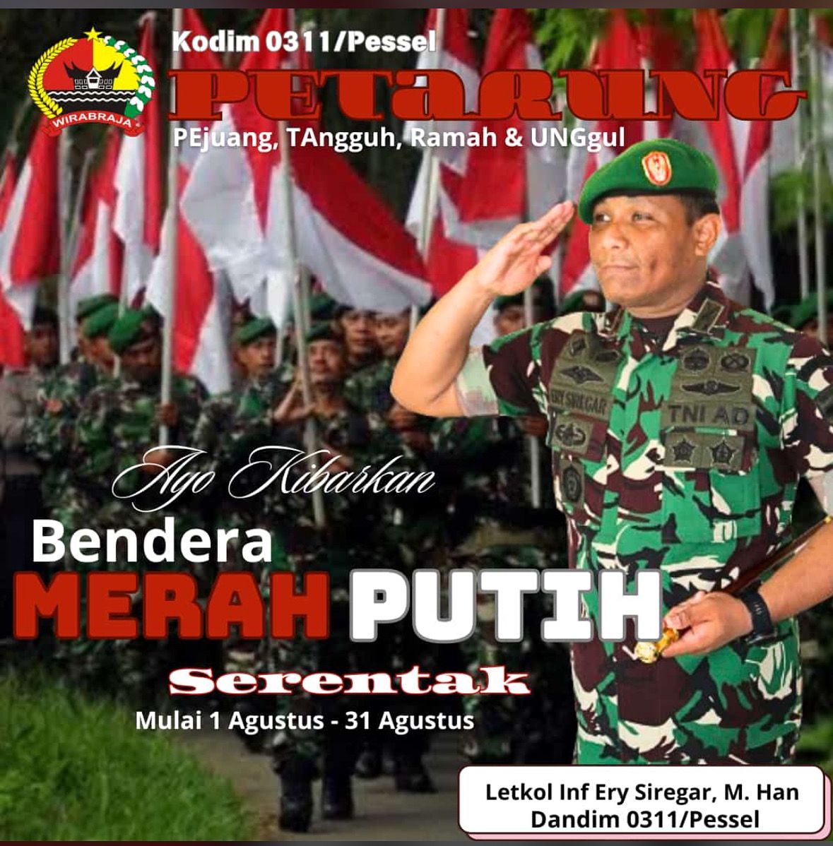 “Dalam rangka menyemarakan HUT ke-79 RI, diwajibkan kepada seluruh jajaran Kodim Pessel agar memasang bendera merah putih 1 tiang penuh di depan kantor koramil masing-masing. TMT hari ini 1 – 31 Agustus 2024,” seru Dandim.