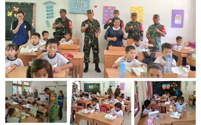 Didampingi anggota, Dandim melakukan Kegiatan pembagian makanan bergizi gratis, untuk anak sekolah SD Santo Petrus Km 5 Tuapeijat dan dilanjutkan beberapa sekolah lainnya.