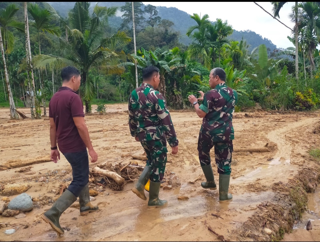 PESISIR SELATAN — Danrem 032/wbr, Brigjen TNI Rayen obersil beserta Dandim 0311/Pessel dan Danramil 07 Tarusan mengunjungi lokasi yang terdampak banjir di Kampung Tanjung Melayu dan Kampung Lubuk Ganggo, Nagari Duku Utara kec koto IX Tarusan Kabupaten Pesisir Selatan Provinsi Sumbar, Senin (11/3/2024) 09.30 Wib.