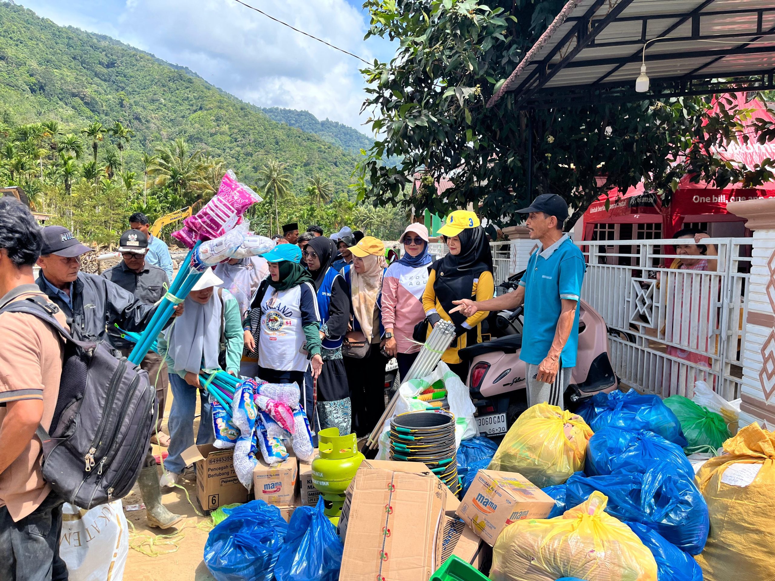 Pesisir Selatan, 5 Desember 2025. Darma Wanita Persatuan (DWP) Kabupaten Pesisir Selatan berkolaborasi dengan Ikatan Wanita Pengusaha Indonesia (IWAPI) dan Komunitas Pertamus Rawang Painan turun langsung membantu warga terdampak banjir dan longsor di Nagari Muaro Aia, Kecamatan Bayang Utara, Jumat (5/12).