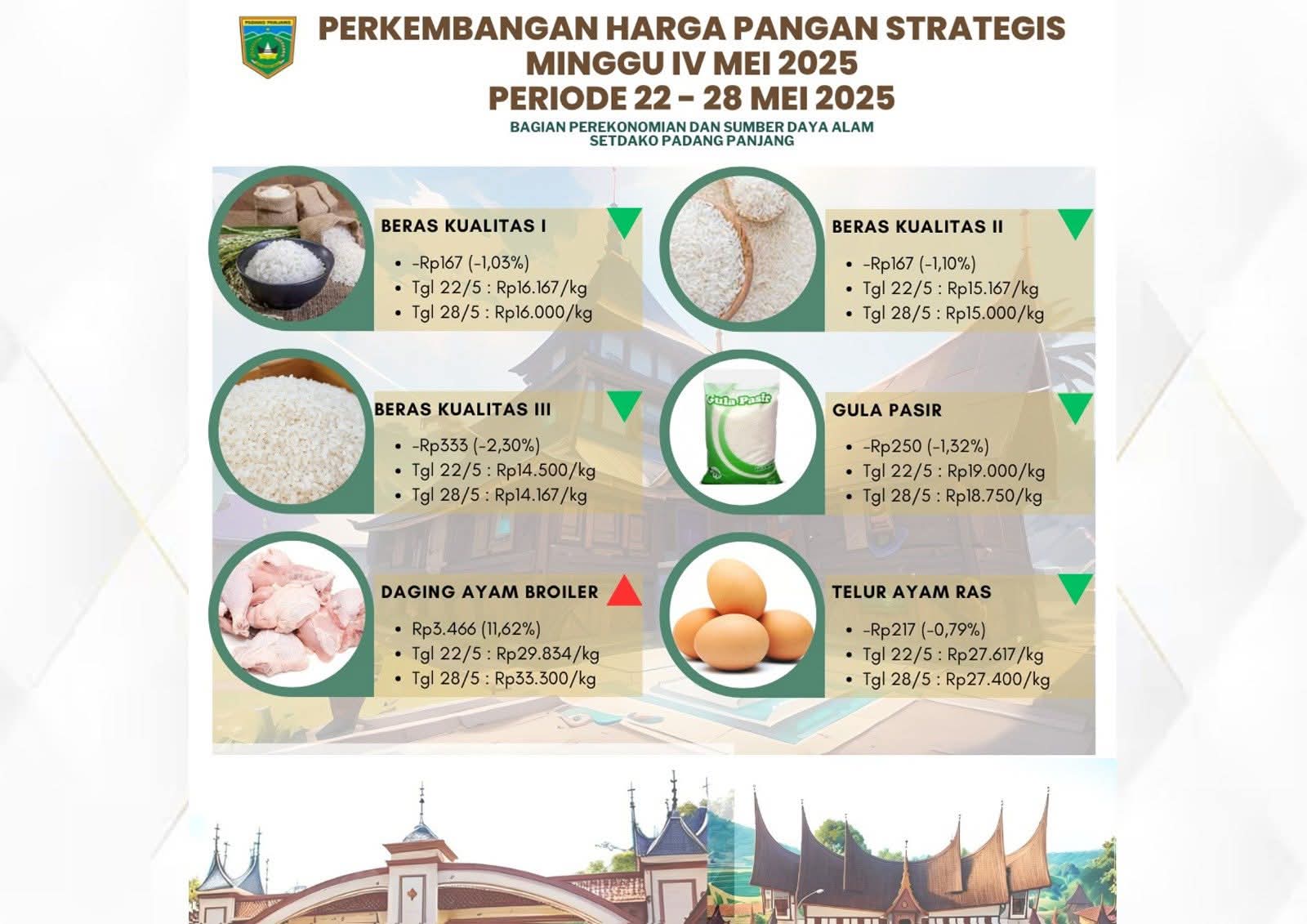 “Harga Beras Kualitas I, II dan III serentak mengalami penurunan pada minggu keempat Mei 2025. Gula pasir, telur ayam ras, bawang merah dan bawang putih juga mengalami penurunan walaupun tidak signifikan dibandingkan minggu sebelumnya,” katanya.