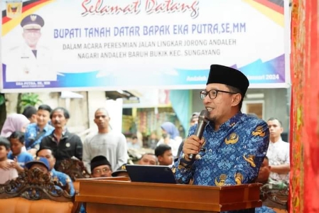 Dalam sambutannya, Bupati Eka Putra menyampaikan, pembangunan sarana dan prasarana jalan merupakan salah satu hal yang priotas. Semua itu dapat ditingkatkan sampai ke pelosok-pelosok nagari tidak terlepas dari dukungan seluruh masyarakat, sehingga pembangunan tersebut dapat dinikmati oleh seluruh masyarakat Tanah Datar.