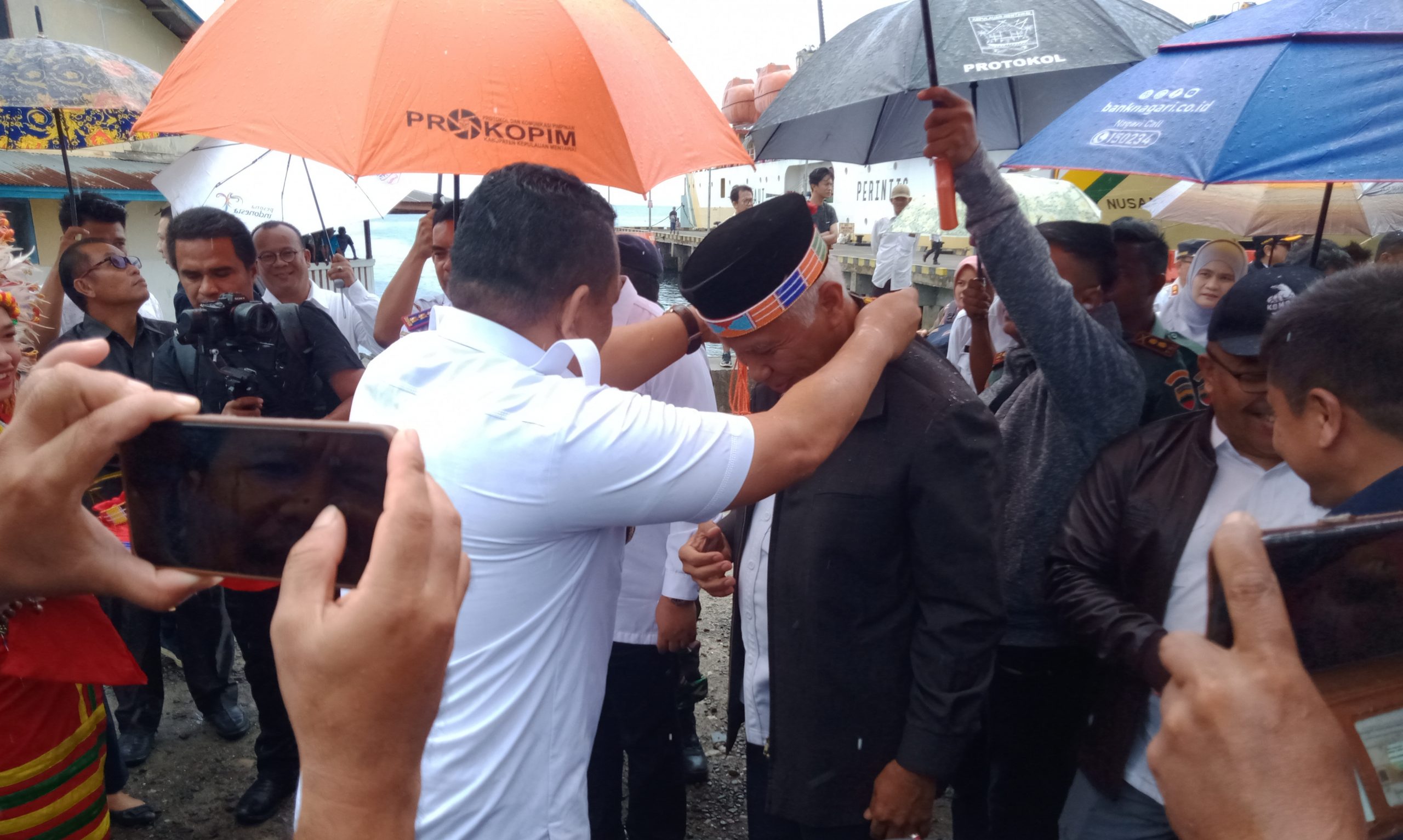 Dalam guyuran hujan, Gubernur Sumbar beserta rombongan tiba sekira pukul 11.00 Wib menggunakan armada laut yaitu Kapal Mentawai Fast. Rabu (28/02/2024)