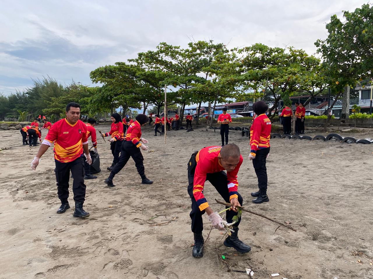 Kegiatan ini melibatkan personel Kepolisian dari Satker Ditpamobvit Polda Sumbar dengan penuh semangat, mereka membersihkan sampah plastik, kayu, dan berbagai jenis limbah yang mengotori pesisir pantai.