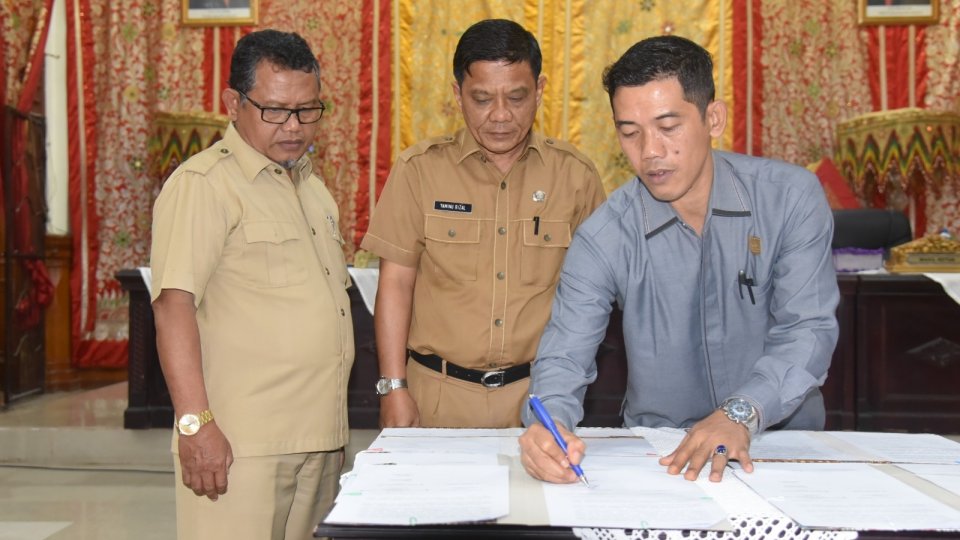 Pengesahan Ranperda RPJPD Kota Pariaman Tahun 2025 – 2045 ditandai dengan penanda tanganan RPJPD Kota Pariaman Tahun 2025 – 2045 oleh Plt.Sekdako Pariaman Yaminu Rizal dengan Wakil ketua I DPRD Kota Pariaman Efrizal. (dewi lestari)