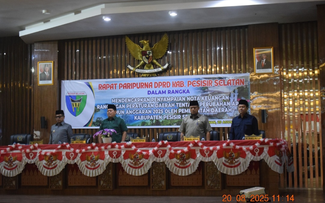 Pesisir Selatan – Dewan Perwakilan Rakyat Daerah (DPRD) Kabupaten Pesisir Selatan menggelar rapat paripurna dengan agenda penyampaian Nota Pengantar Rancangan Peraturan Daerah (Ranperda) tentang Perubahan Anggaran Pendapatan dan Belanja Daerah (APBD) Tahun Anggaran 2025.