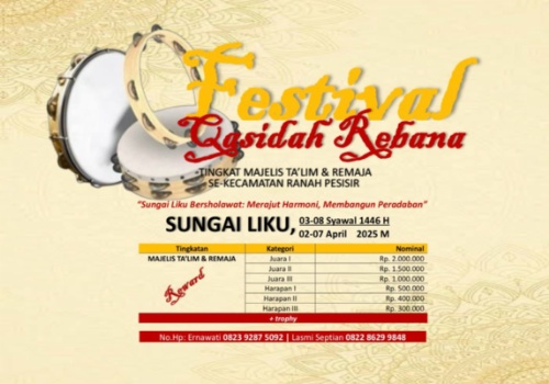 MINANGKABAUNEWS.com, PESISIR SELATAN – Menyambut Idulfitri 1446 H, masyarakat Sungai Liku, Kecamatan Ranah Pesisir, bersiap menggelar Festival Qasidah Rebana tingkat Majelis Ta’lim dan Remaja se-Kecamatan Ranah Pesisir. Acara yang dijadwalkan pada 3-8 Syawal 1446 H (2-7 April 2025) ini mengangkat tema “Sungai Liku Bersholawat: Menyulam Harmoni, Membina Peradaban”. Tidak hanya menjadi ajang kompetisi, festival ini dirancang sebagai wujud syukur atas hari kemenangan sekaligus sarana memperkuat persaudaraan melalui seni Islami penuh makna.