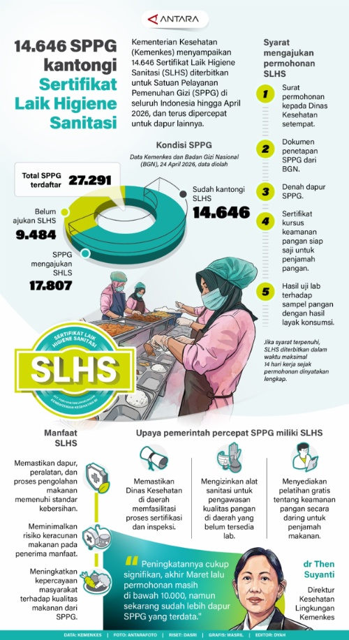 MINANGKABAUNEWS.com, INFOGRAFIK — Kementerian Kesehatan (Kemenkes) menyampaikan 14.646 Sertifikat Laik Higiene Sanitasi (SLHS) diterbitkan untuk Satuan Pelayanan Pemenuhan Gizi (SPPG) di seluruh Indonesia hingga April 2026, dan terus dipercepat untuk dapur lainnya. (ANTARA)