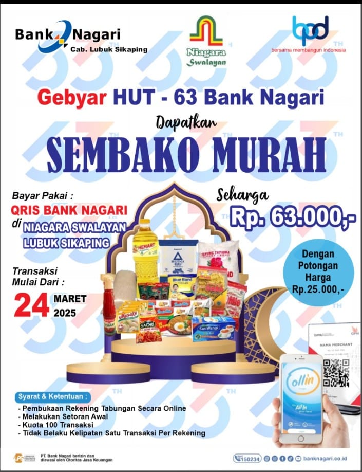 Pimpinan Cabang Bank Nagari Lubuk Sikaping, Budi Lica Candra menyampaikan bahwa dalam rangka memeriahkan HUT Bank Nagari ke-63 menyelenggarakan “Sembako murah” dengan membayar pakai Qris Bank Nagari di Niagara Swalayan Lubuk Sikaping, Jumat (21/03/2025)