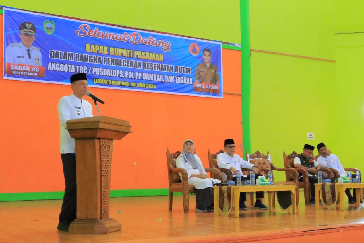Pasaman, Minangkabaunews.com – Guna tingkatkan petugas atau kesatuan yang handal dan profesional seluruh unsur dari anggota TRC, Pusdalops, Pol PP, Damkar dan Tagana gelar pengecekan kesehatan.Kegiatan ini ditinjau langsung oleh Bupati Pasaman Sabar AS, di GOR Tuanku Rao Lubuk Sikaping, (28 /6/2024).