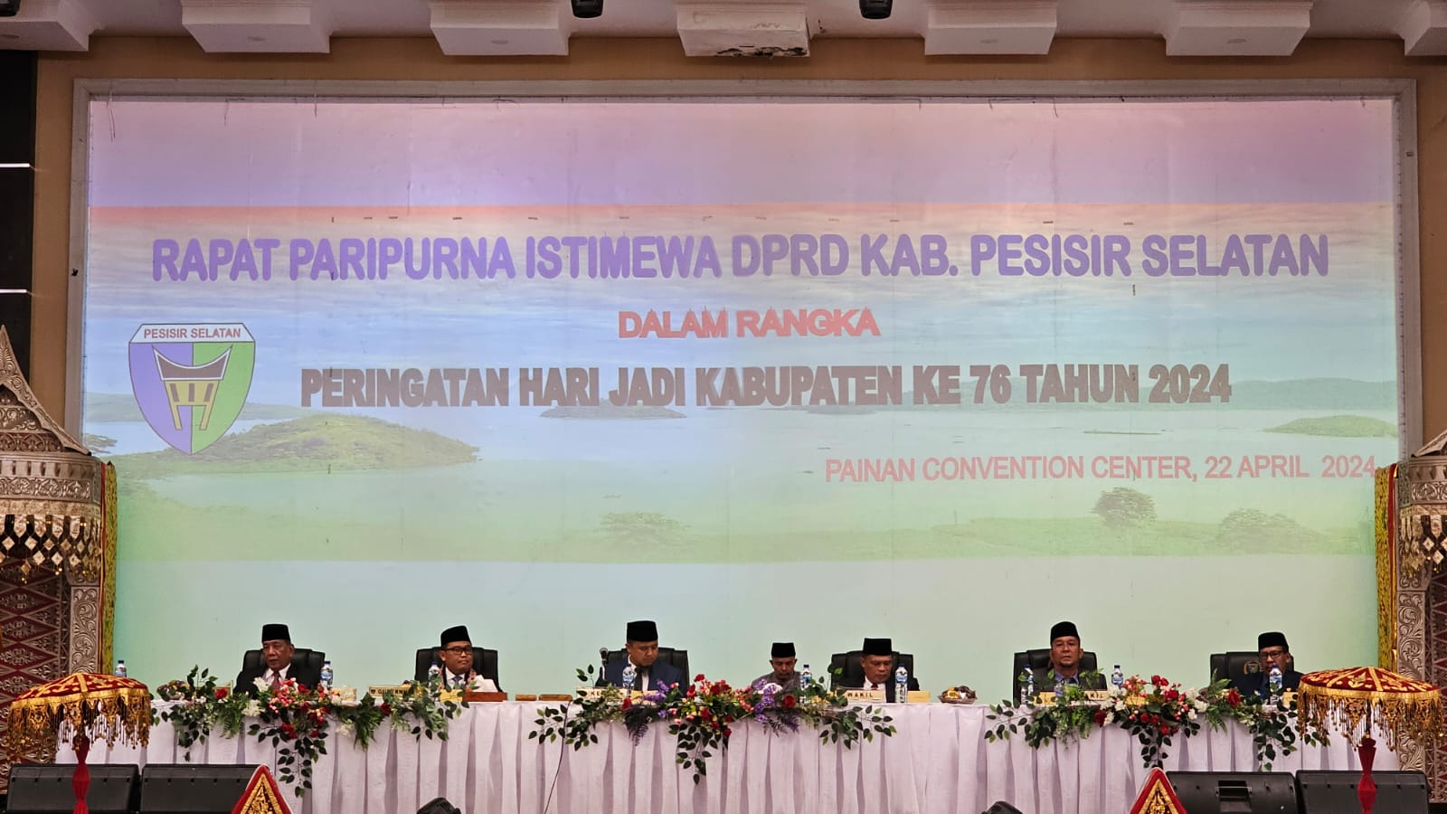 PESISIR SELATAN, MINANGKABAUNEWS – Rapat paripurna istimewa Dewan Perwakilan Rakyat Daerah (DPRD) Kabupaten Pesisir Selatan tahun ini digelar di Gedung PCC Kabupaten Pesisir Selatan Sumatera Barat, Senin, (22/04/2024).