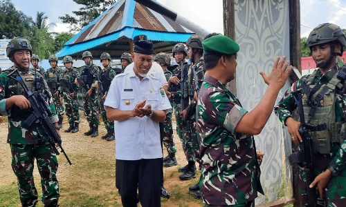 Usai diskusi dengan Forkopimda PBD, Gubernur Mahyeldi bersama Forkopimda Sumbar menunaikan janji kepada pasukan Satgas Yonif 133/YS, untuk melihat langsung kondisi prajurit pengamanan yang telah bertugas lebih kurang enam bulan di Provinsi PBD.
