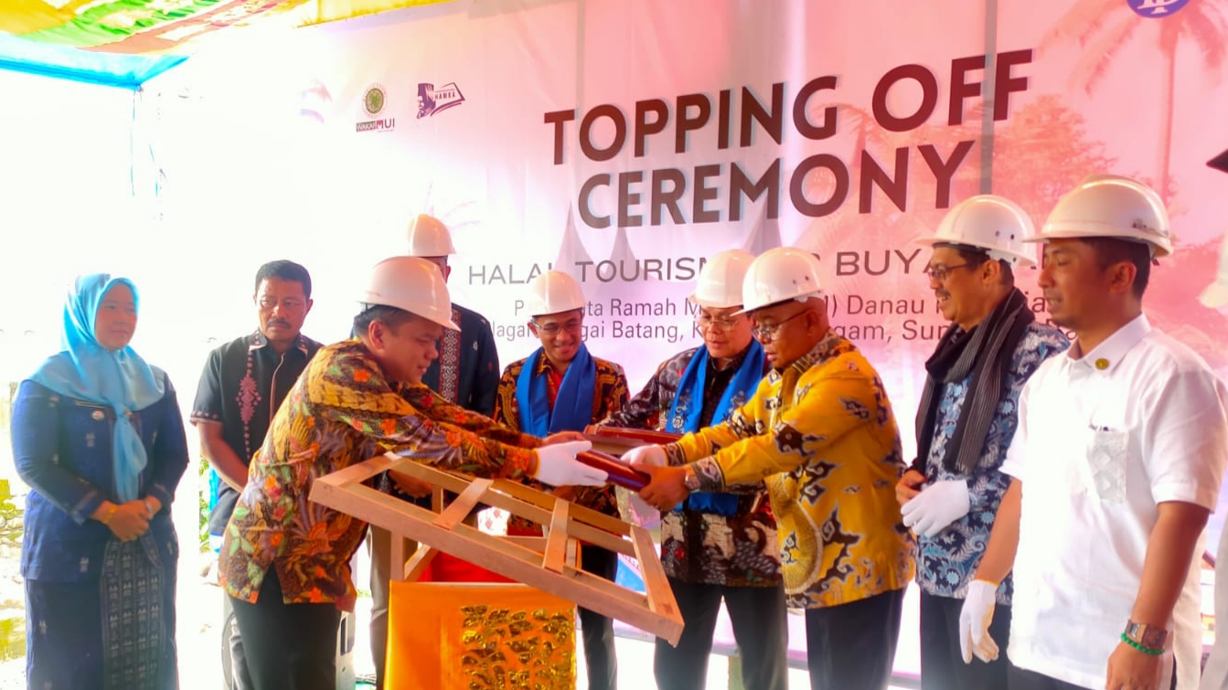 Sekretaris Jenderal MUI Dr. Amirsyah Tambunan, MA bersama Sekretaris Daerah Kabupaten Agam Drs Edi Busti, M.Si dan Kepala Departemen Ekonomi dan Keuangan Syariah (DEKS) Bank Indonesia Imam Hartono, didampingi Sekretaris Lembaga Wakaf MUI Guntur Subagja Mahardika, Asisten Staf Khusus Wakil Presiden RI Dhika Yudistira, dan Wali Nagari Sungai Batang Ahsin Chaniago serta ahli waris keluarga Buya Hamka dan keluarga Fatimah Karim Amrullah – AR Sutan Mansur, melaksanakan penutupan atap (topping off) gedung Halal Tourism Hub Buya Hamka secara simbolik, Sabtu, (9/3/2024).
