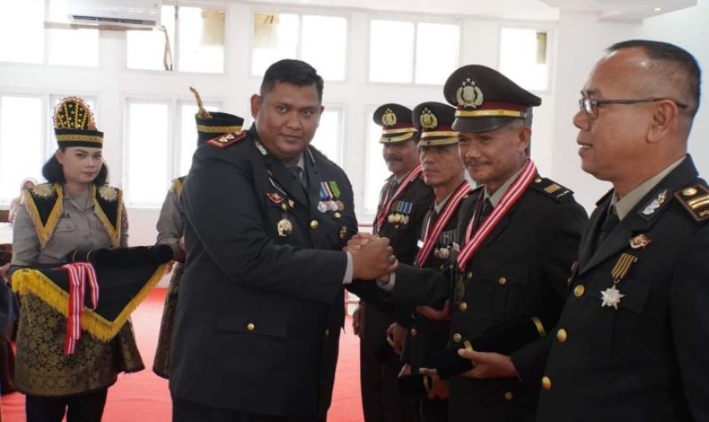 Serta pengalungan medali dan penyerahan Piagam Wisuda Purnabakti, di antaranya kepada AKBP (Purn) Iswarman, SH, AKBP (Purn) Sofyan Effendi, AKP (Purn) Edy Priyono, AKP (Purn) Halnif, Iptu (Purn) Risnaldi Handri, Penata Tk I (Purn) Yanusti Musalina dan Penata Tk I (Purn) Cut Darmala.