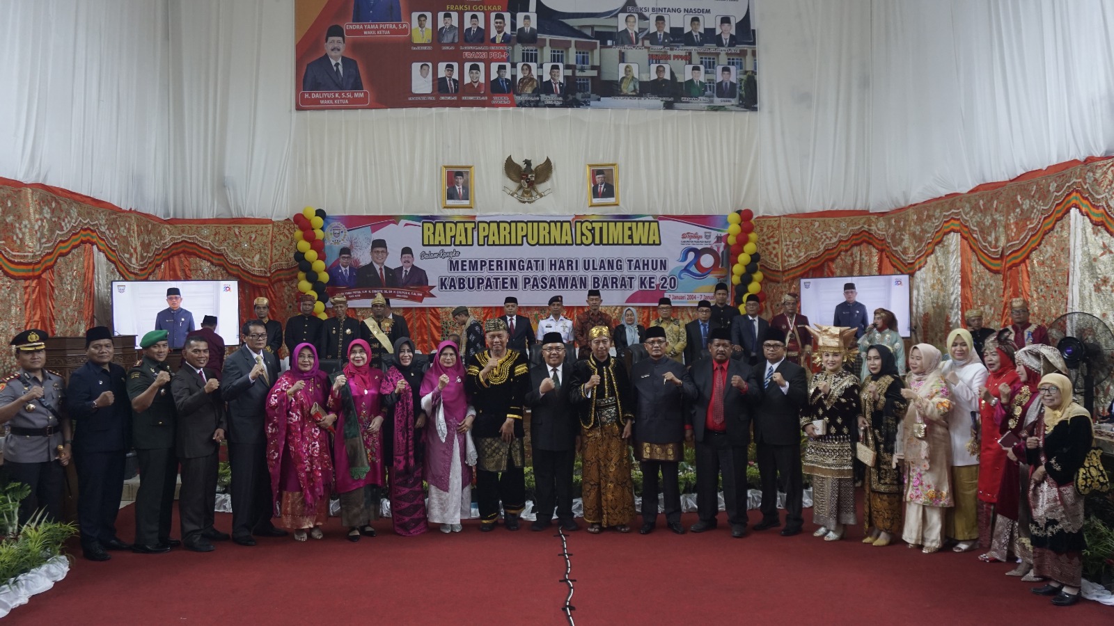 PASAMAN BARAT – Hari Jadi Kabupaten Pasaman Barat ke-20 tahun 2024, menjadi momentum yang istimewa untuk bersama mempererat silaturahmi dan kebersamaan. Hal ini disampaikan Gubernur Sumatera Barat melalui Sekretaris Daerah Provinsi Hansastri dalam Rapat Paripurna Istimewa di Ruangan Sidang DPRD Pasaman Barat, Minggu (7/1/2024).