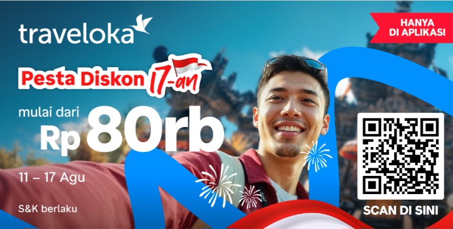 Promo ini memberikan potongan harga hingga 50% untuk berbagai produk perjalanan, termasuk tiket pesawat, hotel, hingga atraksi liburan. Tersedia juga kupon tambahan hingga Rp1,7 juta yang bisa Anda gunakan saat checkout. Promo ini berlaku pada 31 Juli hingga 10 Agustus 2025, khusus melalui aplikasi Traveloka.