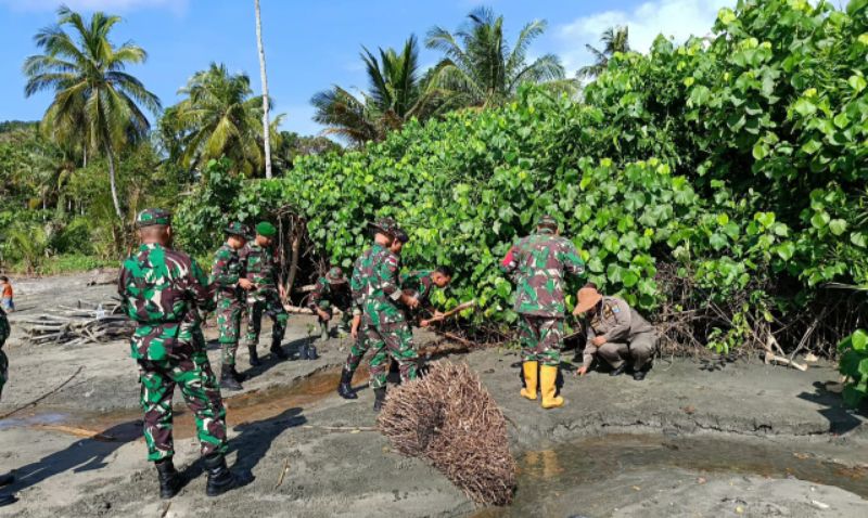 Diketahui jajaran Koramil 04 Sikakap melaksanaan pencarian bibit Mangrove dihutan bakau di Dusun Mabolak Desa Sikakap.
