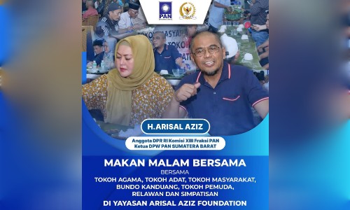 MINANGKABAUNEWS.com, PADANG — Arisal Aziz, Anggota DPR RI Komisi XIII Fraksi Partai Amanat Nasional (PAN) sekaligus Ketua DPW PAN Sumatera Barat, menggelar acara makan malam bersama, di Yayasan Arisal Aziz Foundation. Kegiatan tersebut dihadiri oleh berbagai elemen masyarakat mulai dari tokoh agama, tokoh adat, tokoh masyarakat, Bundo Kanduang, tokoh pemuda, relawan, hingga simpatisan. Suasana keakraban sangat terasa dalam pertemuan ini, yang bertujuan memperkuat jalinan silaturahmi dan sinergi antara tokoh masyarakat dengan para pemimpin daerah.