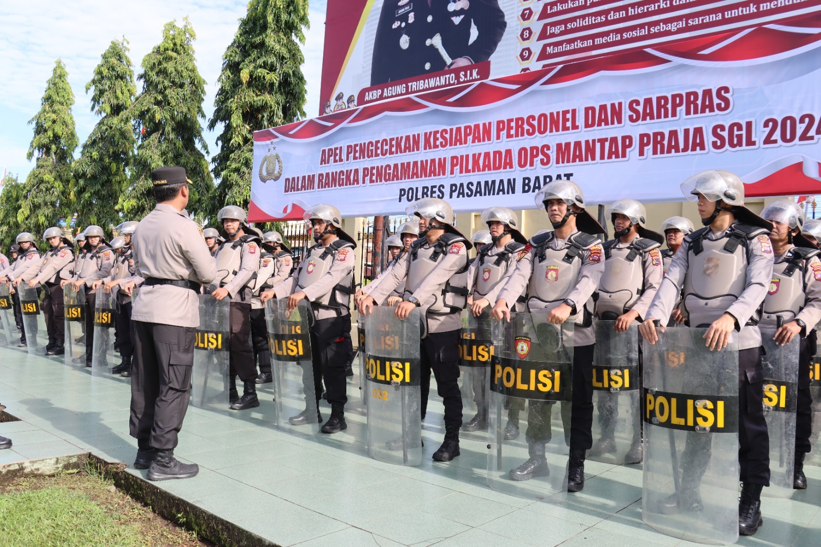“Apel dan pengecekan ini guna memastikan kesiapsiagaan dan peralatan para personel yang akan digunakan selama pelaksanaan Operasi Mantap Praja Singgalang 2024, dalam menjaga Keamanan dan Ketertiban (Kamtibmas) selama tahapan Pilkada serentak 2024 mendatang,” ucap Kapolres Pasaman Barat AKBP Agung Tribawanto.