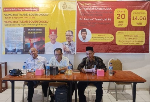 – Dewan Pimpinan Daerah (DPD) SatuPena Provinsi Sumatra Barat (Sumbar) menyelenggarakan kegiatan bedah buku berjudul Bung Hatta and Boven Digoel When a Papuan Cried to Me, (Bung Hatta dan Boven Digoel Ketika Seorang Papua Menangis Padaku) karya Ketua DPD SatuPena Provinsi Sumatra Barat Sastri Bakry, Kamis (20/6/2024) di salah satu café di jalan Samudera Padang.