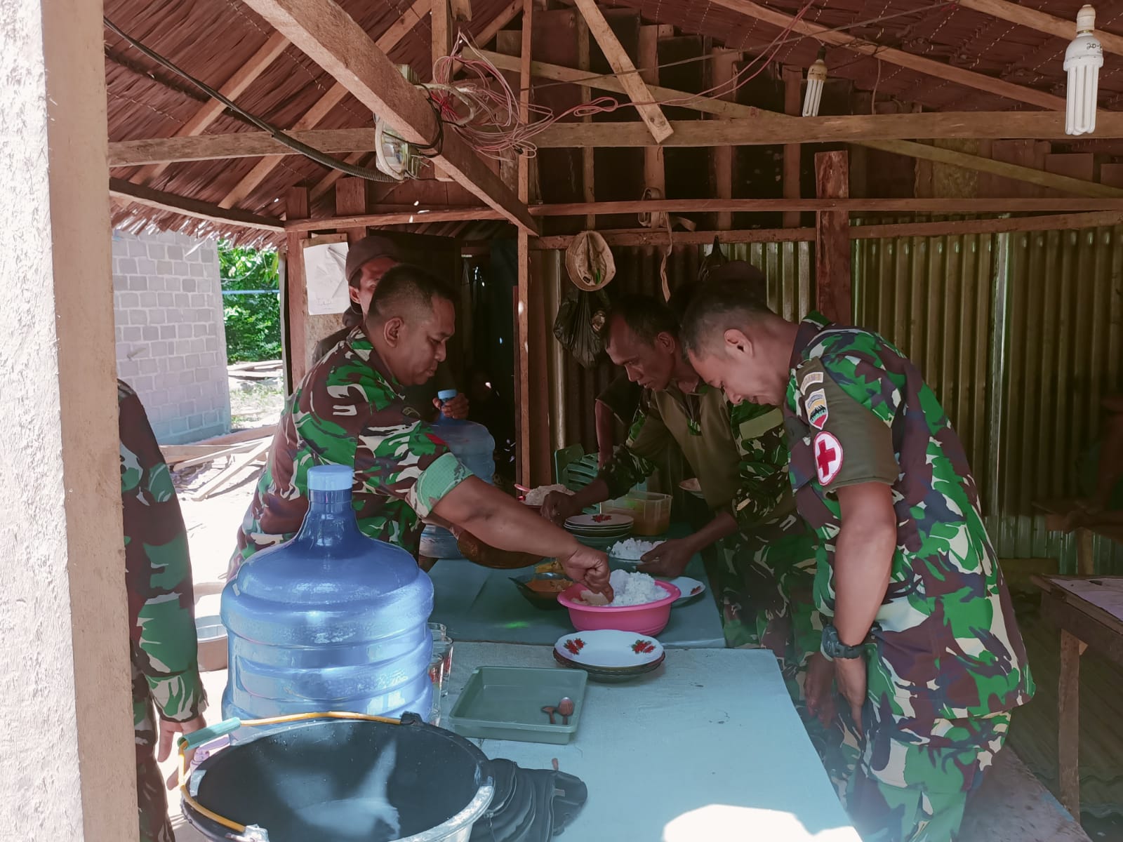 Dengan peralatan makan yang seadanya bagi anggota satgas tidak mengurangi kenikmatan menyantap hidangan yang ada. Sembari menikmati makan siang, Sesama anggota Satgas saling bersenda gurau, Tak nampak kelelahan di wajah mereka.