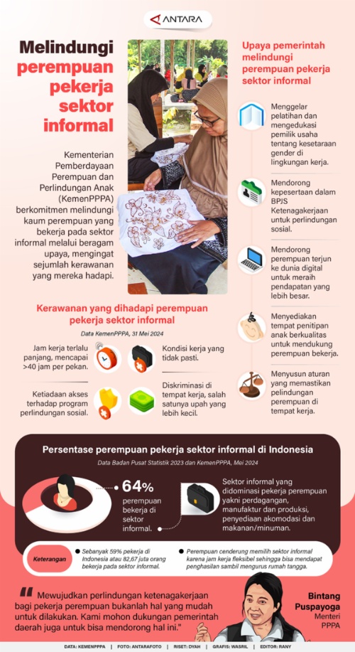 MINANGKABAUNEWS.com, INFOGRAFIS — Kementerian Pemberdayaan Perempuan dan Perlindungan Anak (KemenPPPA) berkomitmen melindungi kaum perempuan yang bekerja pada sektor informal melalui beragam upaya, mengingat sejumlah kerawanan yang mereka hadapi. (ANTARA)